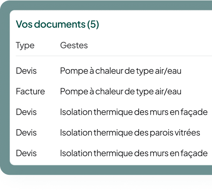 Identification automatique des documents par nature (devis, factures) et par geste (isolation, chauffage, etc).